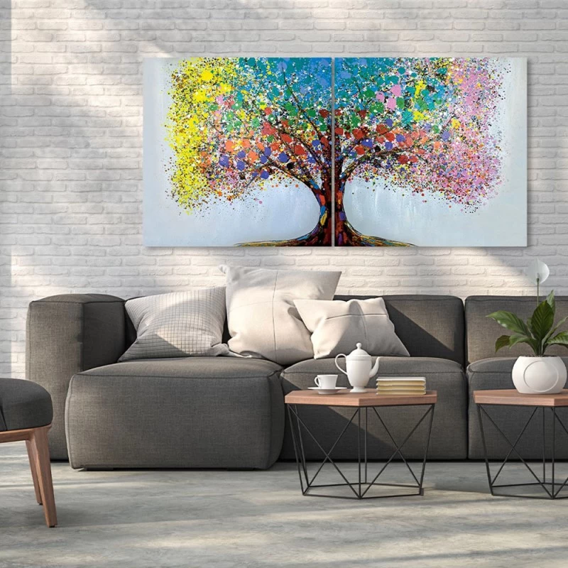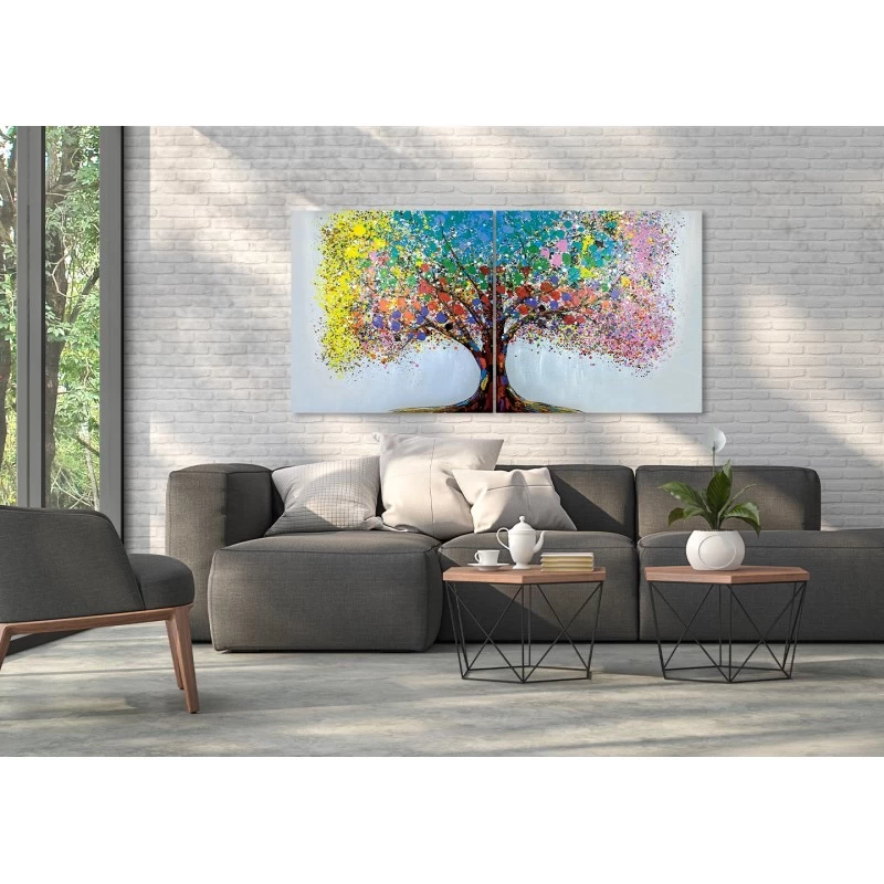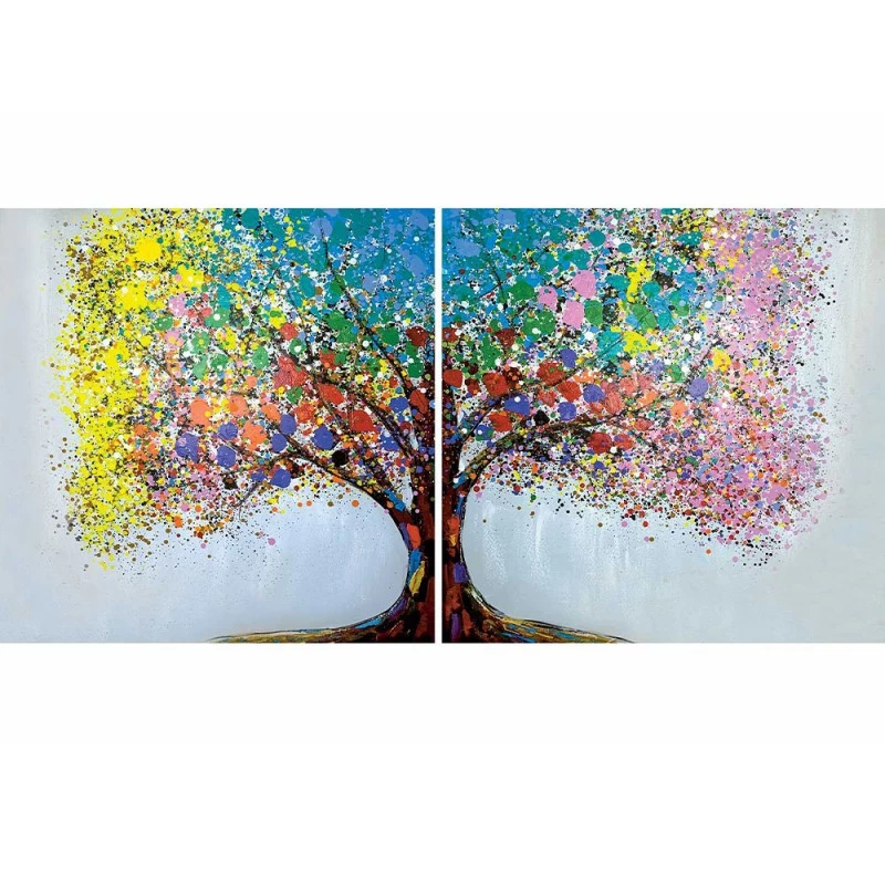Si compone di due tele differenti e speculari, che assieme tracciano l’identità di un variopinto albero.