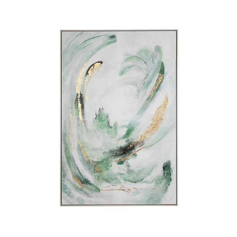Realizzato a mano su tela, il quadro astratto di Bizzotto riporta inserti luminosi in lamina dorata.