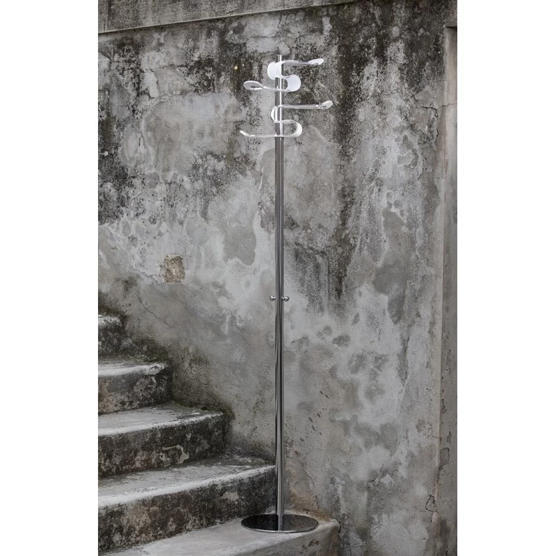 La base e l’asta centrale dell’appendiabiti Vesta sono in acciaio, mentre la parte deputata ad attaccapanni è in plexiglass monosatinato bianco e dalla forme ondulate.