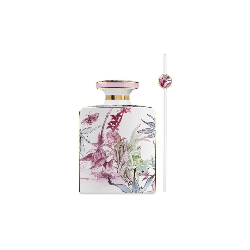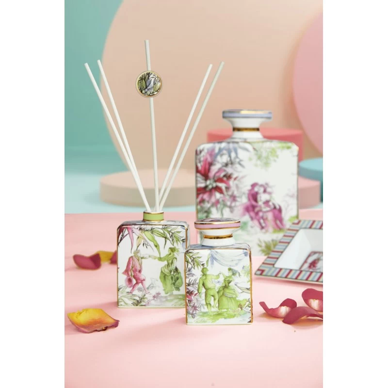 Elegante complemento d’arredo olfattivo, riporta un disegno bucolico e fantasioso, con colori pastello delicato e punti luce oro.