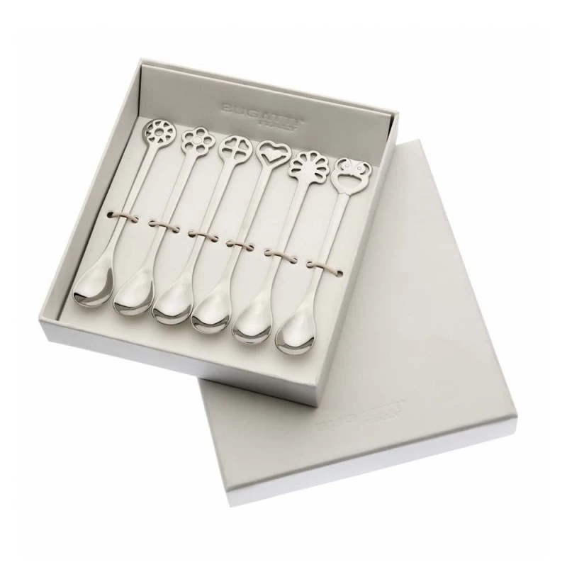 Il set di 6 cucchiaini moka Portafortuna di Bugatti è già corredato di elegante astuccio: per questo è una perfetta idea regalo utile! Questi accessori per la tavola e la cucina Bugatti sono realizzati in resistente acciaio inox e contraddistinti ciascuno da un diverso simbolo portafortuna.