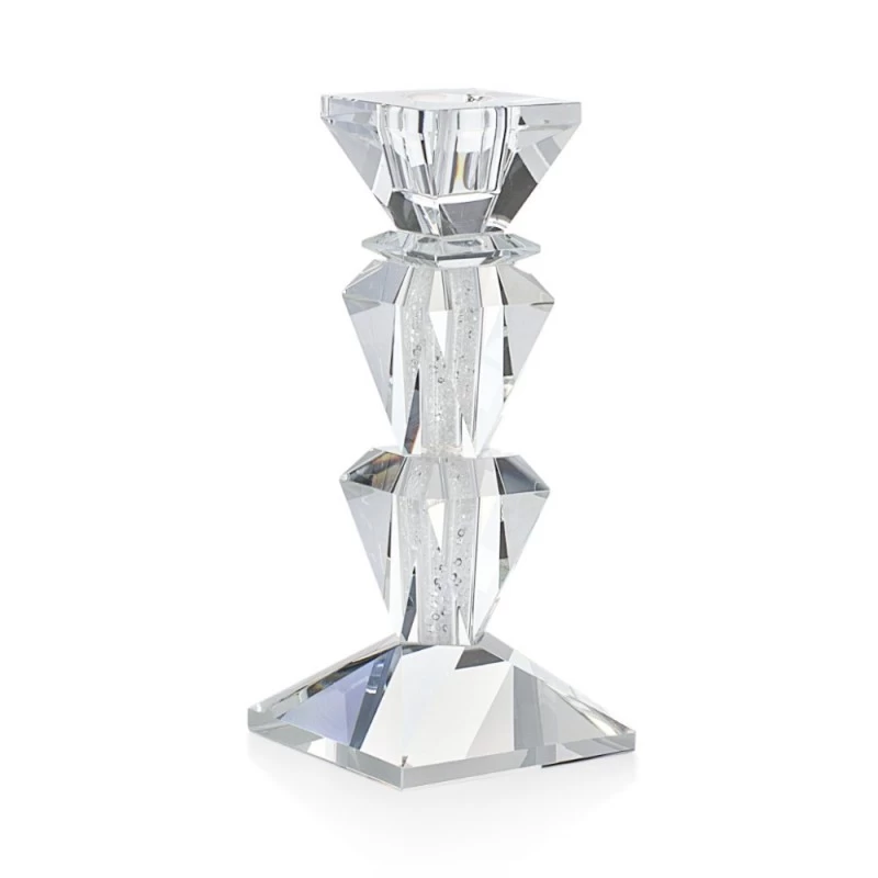 Lo splendido candeliere poligonale in cristallo Ghiaccio di Emò Italia medio arreda con garbo ogni ambiente e la tavola delle grandi occasioni. Perfetto come idea regalo home decor o bomboniera elegante.