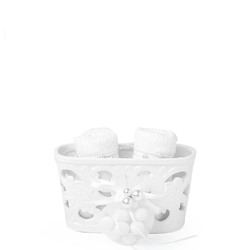 Il contenitore porta asciugamani con saponi firmato Hervit, è realizzato in finissima porcellana con preziosi trafori damascati. Elemento che aggiungerà raffinatezza al vostro bagno e perfetto come elegante e utile idea bomboniera da matrimonio.