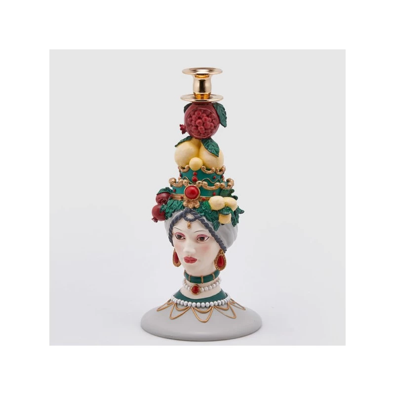 È un candeliere a forma di testa di moro femminile, caratterizzato da un design e da dettagli decisamente glam.