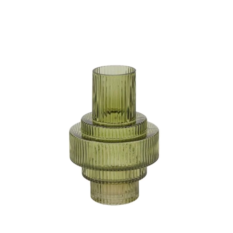 Realizzato in vetro verde con sezioni verticali scanalate, è perfetto per essere impreziosito da rami e fiori artificiali EDG.