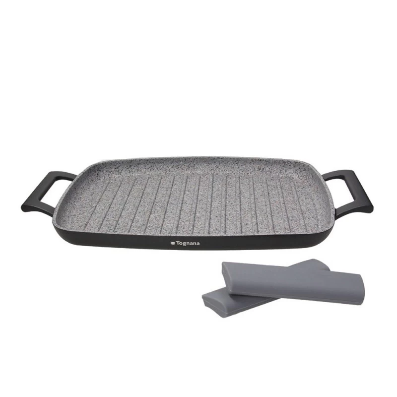 Grill rettangolare 37×28 cm più due presine in silicone appartenente alla linea Ambiziosa di Tognana. Caratterizzata dal corpo in fusione d’alluminio con fondo ad alto spessore in acciaio termoradiante.