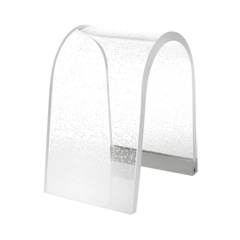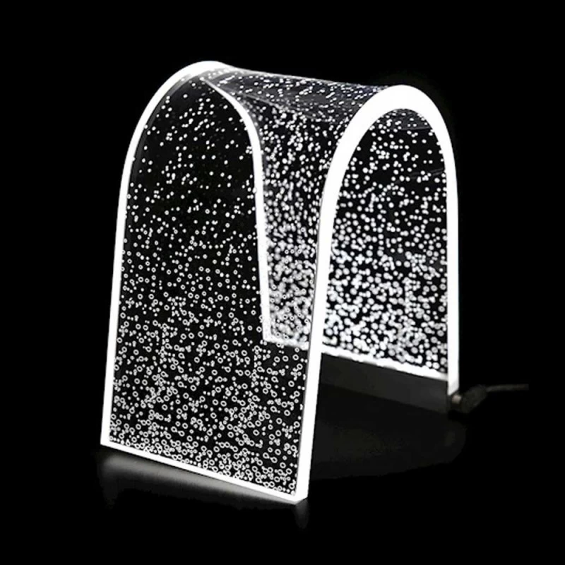 Lampada piccola a led “Arc” firmata Vesta nella variante “bubbles”. Un oggetto d’arredamento inciso con tecnologia laser e realizzato in cristallo acrilico piegato a mano.