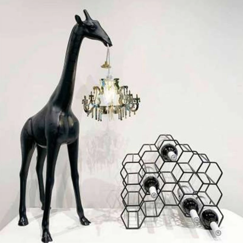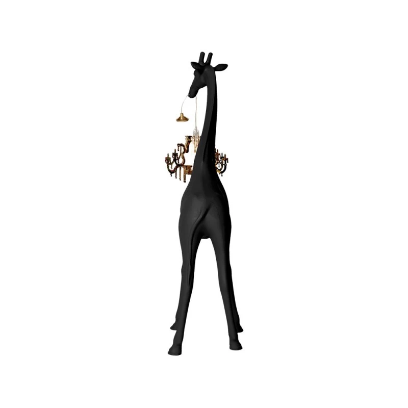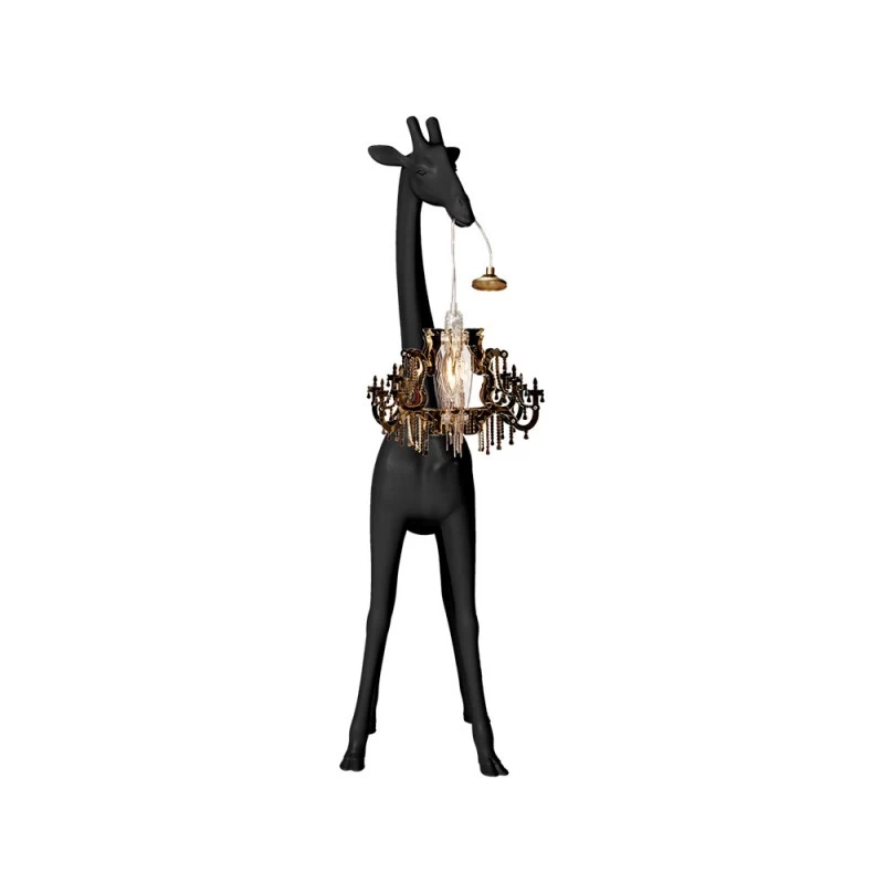 Elegante ed esuberante, questo complemento d’arredo è particolare: una lampada a forma di giraffa che sorregge un raffinato chandelier oro.