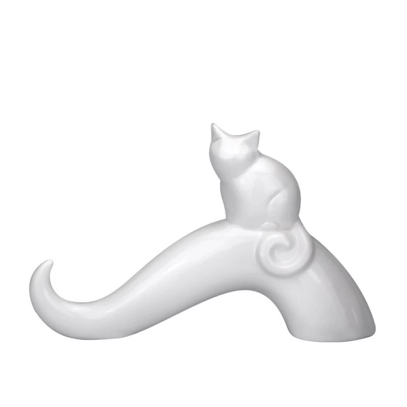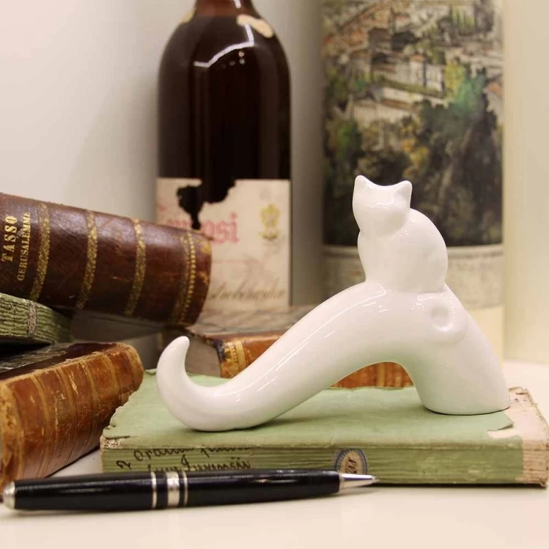 Il simpatico corno napoletano bianco di Macrì è impreziosito da un piccolo gattino stilizzato, posto sulla curvatura del cornetto.