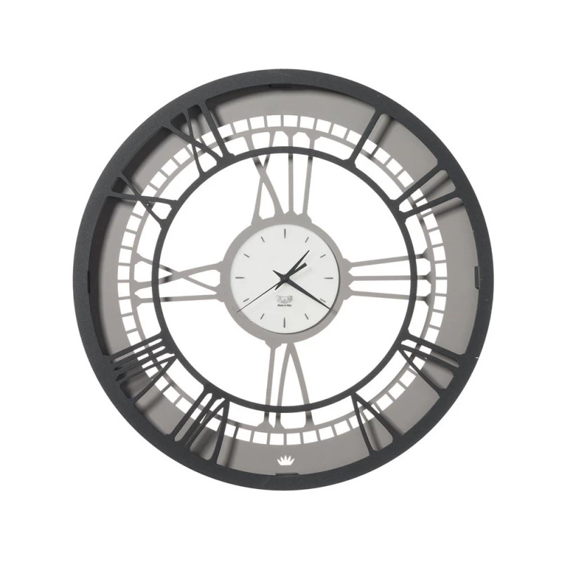 È un orologio da parete in ferro tagliato al laser e poi verniciato nei colori ardesia e nero, con quadrante chiaro.