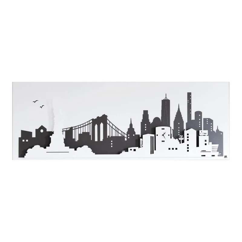 Il pannello “New York” di Arti e Mestieri è un grande orologio da parete realizzato interamente in ferro. Un complemento d’arredo dal design ultra moderno raffigurante la grande metropoli di New York in 3d di colore bianco antracite adatto ad impreziosire il tuo ambiente domestico.