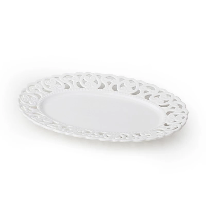 Il piatto ovale in porcellana bianca traforata di Hervit Creations è un piccolo gioiello, che brillerà sulla tavola elegante delle occasioni più felici. Inoltre, si pone quale ideale bomboniera per matrimonio utile e raffinata, l’idea regalo perfetta per i tuoi cari.