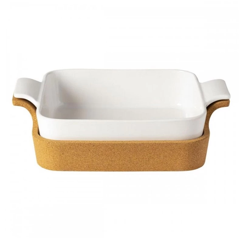 È una pirofila da forno in stoneware bianco, resistente e dal design essenziale. Corredata da una base in sughero naturale.