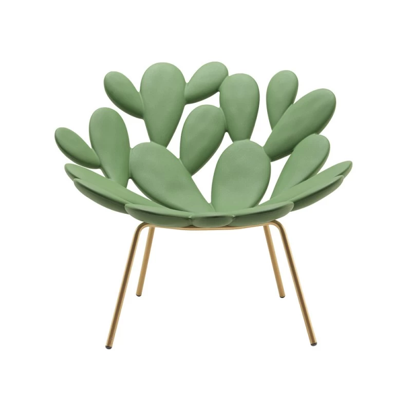 La poltrona ha una seduta che richiama le pale di fico, qui proposte in una versione verde (Balsam Green) con piedi color ottone.