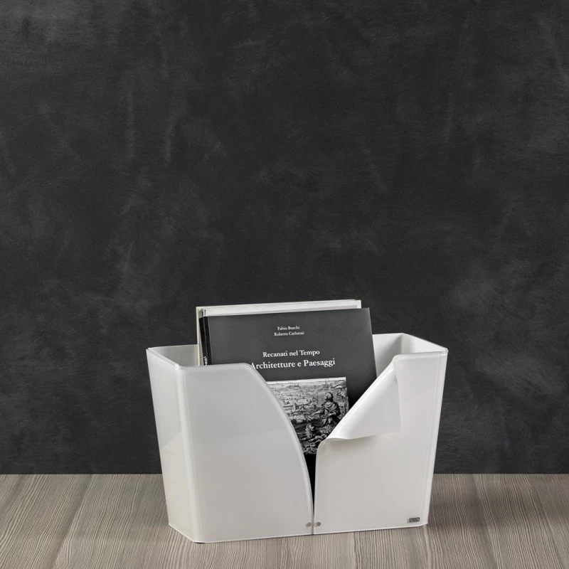Comodo da sistemare in ogni ambiente, è un portariviste di design, un complemento d’arredo dalla forma semplice impreziosito da una piegatura stilosa.