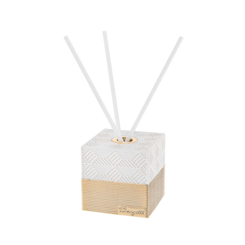 Il profumatore per ambienti con bastoncini di Bongelli Preziosi è qui proposto nella colorazione bianco ed oro.