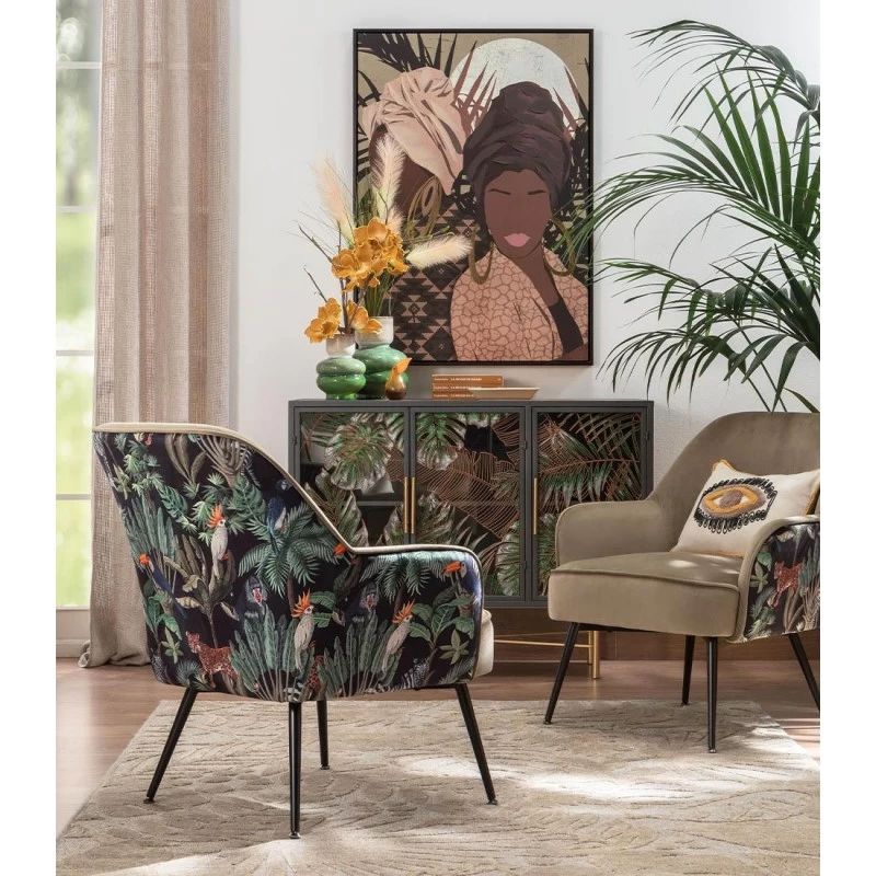 Il quadro con cornice firmato L’Oca Nera offre uno scenario femminile e cosmopolita, rimando a luoghi esotici.