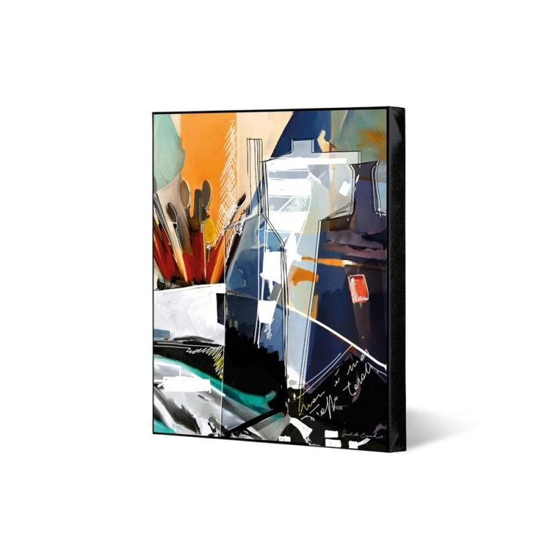 Perfetto come quadro su tela da appendere nello studio o nel living, ha cromie importanti ed uno stile che vira verso l’astrattismo.