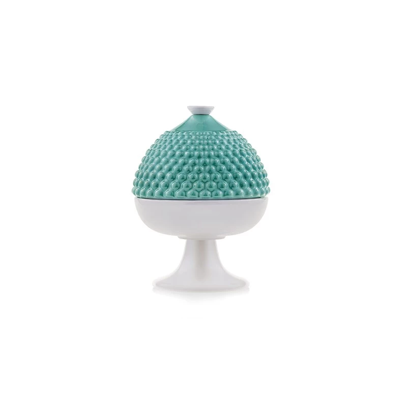 La scatola decorativa a forma di pumo di Emò Italia è qui proposta nella versione con coperchio verde tiffany.