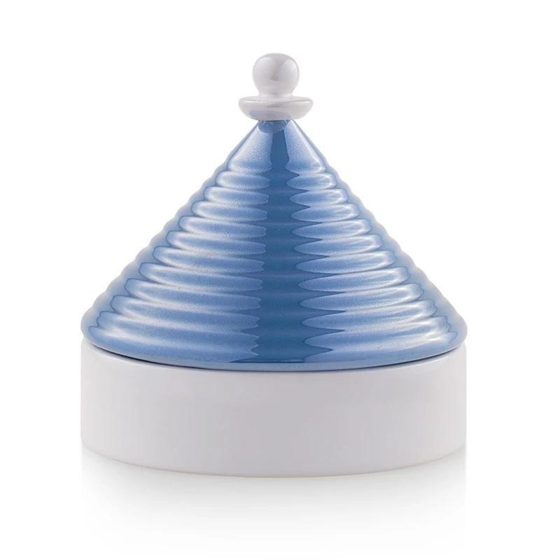 È caratterizzata da un frizzante coperchio blu, la scatola portaoggetti a forma di trullo di Emò Italia della collezione Trullallà.