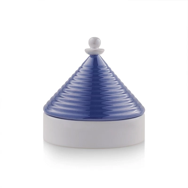 Dal coperchio blu cobalto profondo, la scatola portaoggetti a forma di trullo di Emò Italia.
