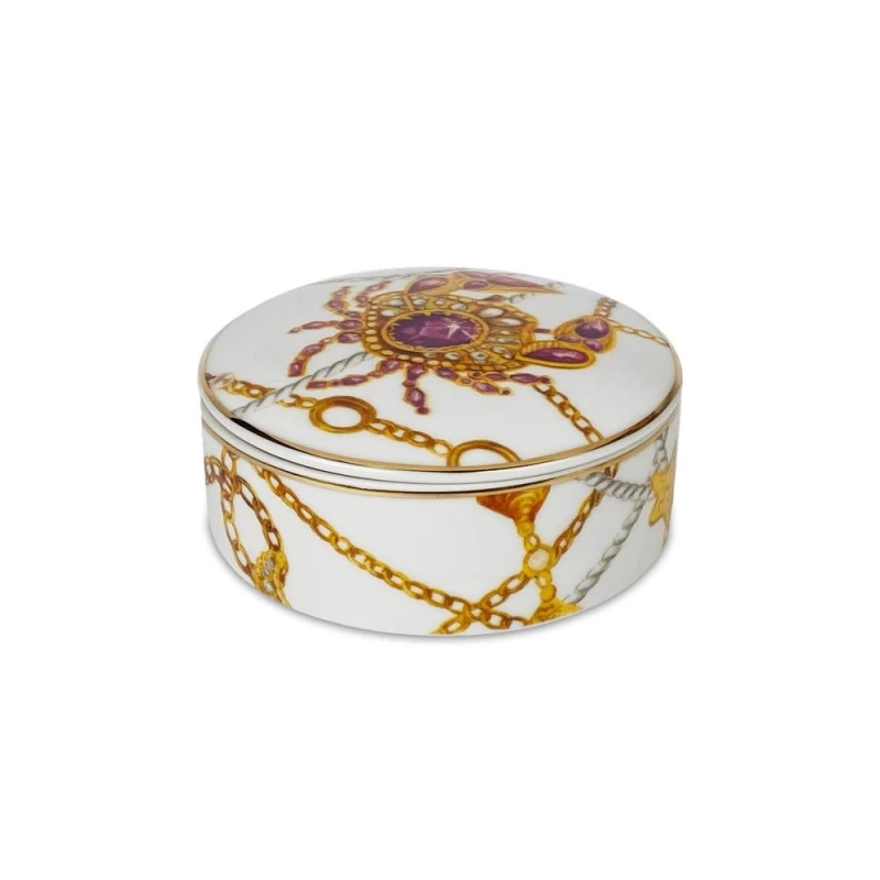 È una scatola tonda in stile marino e dal mood glam chic, dove pietre preziose, ori e creature marine si fondono come in una scenografia suggestiva.