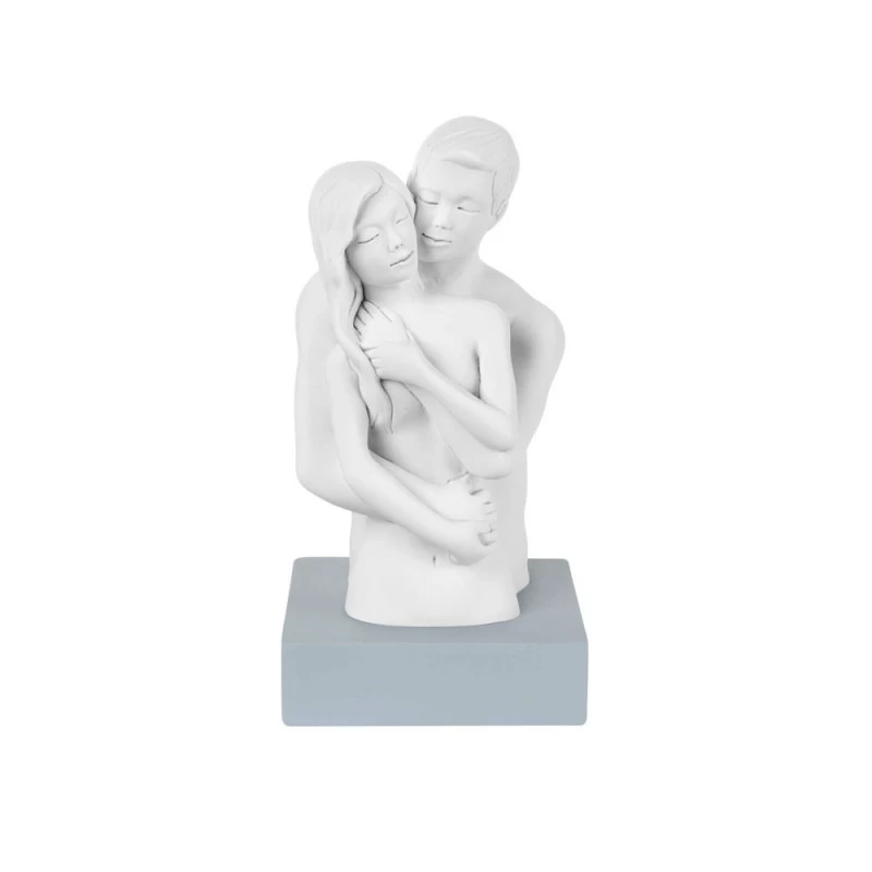 Un oggetto home decor in marmorino (polvere di marmo) bianco con base azzurra, che raffigura una coppia di amanti stretta in un intreccio appassionato.