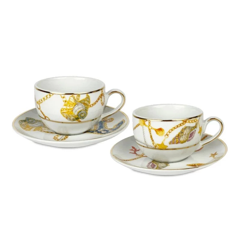 Il set è realizzato in porcellana e contempla due tazze da tè e due piattini in coordinato.