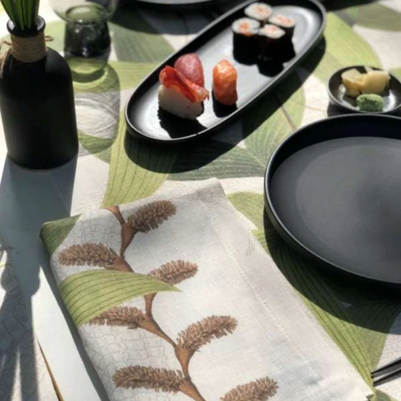 Il set con 4 tovaglioli in puro lino italiano “Palmier” di The NapKing è perfetto per le mise en place estive.