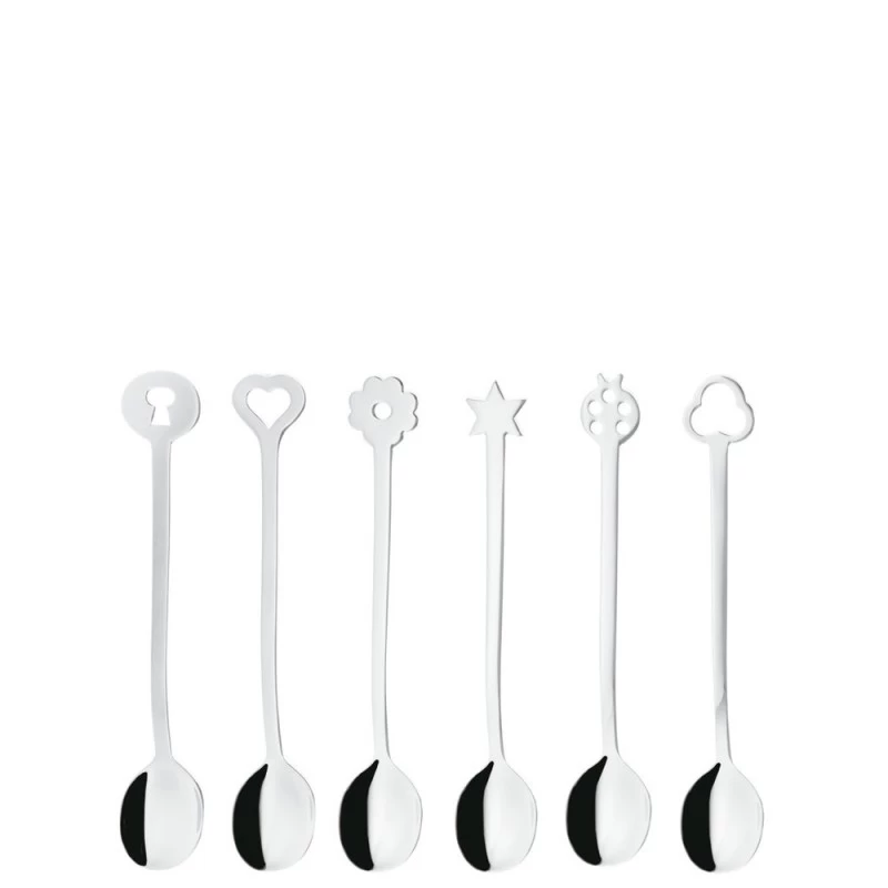 Il set di 6 cucchiaini della linea Party Portafortuna di Sambonet in acciaio inox 18/10 è decorato con terminali a forma di simboli portafortuna. I cucchiaini sono perfetti per gustare dessert e caffè in compagnia di persone speciali e sono un’ottima idea come bomboniera utile da matrimonio.