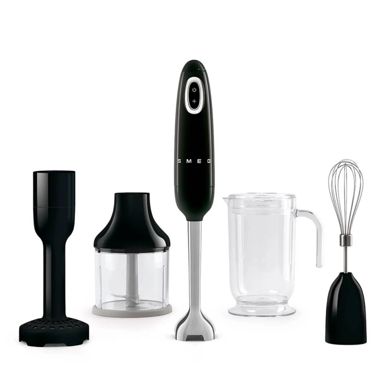 Il frullatore ad immersione di Smeg della linea 50’s Style nero è un piccolo elettrodomestico da cucina dal design vintage. Completo di più accessori, è perfetto anche come idea regalo utile.