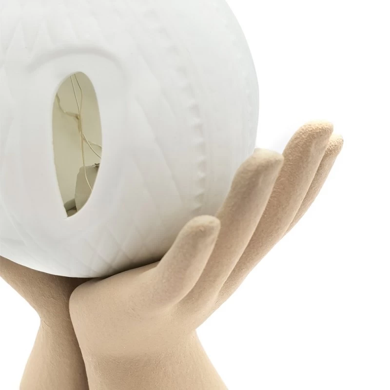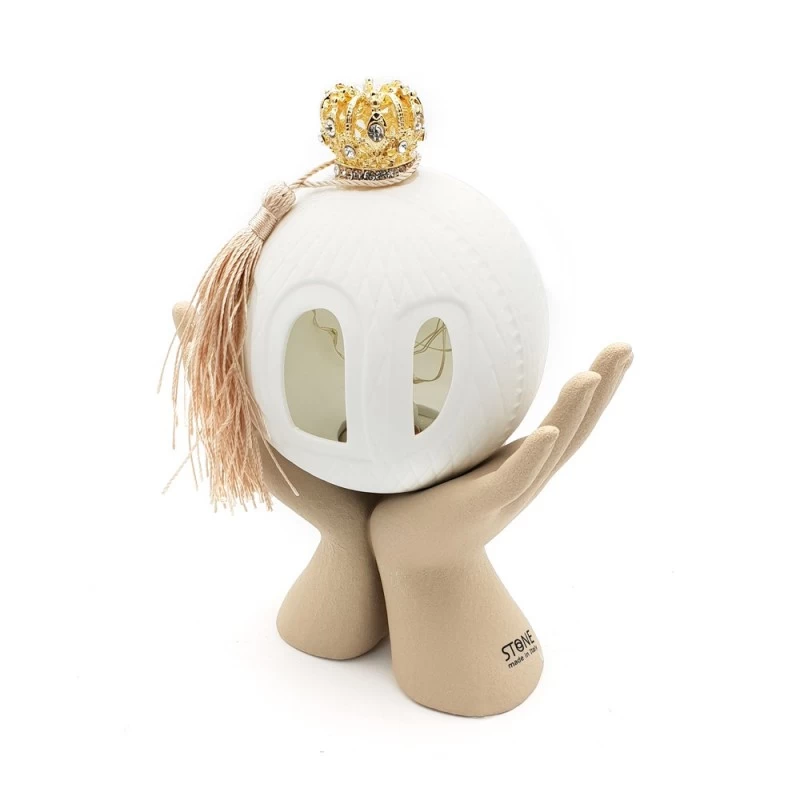 Magnifica scultura in gres porcellanato prodotta da Stone. Due mani aperte reggono una sfera traforata con led su cui poggia una regale corona impreziosita da nappine in tessuto. Una fantastica idea bomboniera per le proprie nozze.