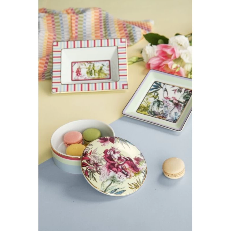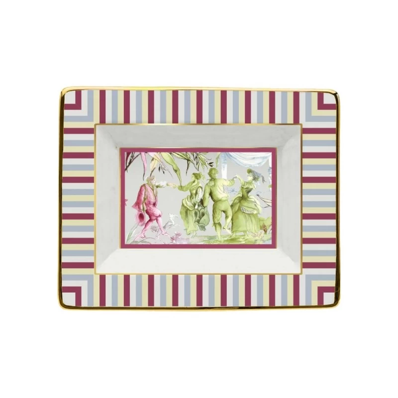 Caratterizzato da un decoro vintage con coppie che danzano, indossando abiti antichi, questo svuotatasche in porcellana offre un impatto visivo unico, elegante.