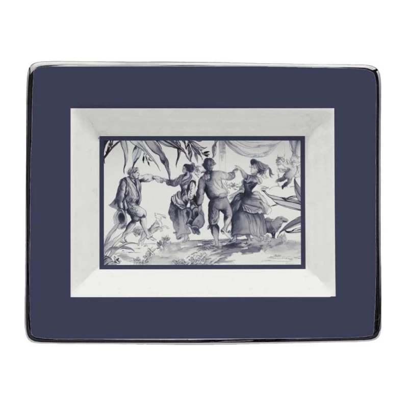 Elegante oggetto home decor, questo svuotatasche rettangolare gode di una decorazione esclusiva e di classe, un motivo Toile de Jouy impreziosito da un bordo argentato e luminoso.