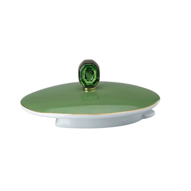 Realizzata in porcellana, riporta dettagli in oro dipinti a mano e un pomello di pregio, realizzato in cristallo Swarovski, che riprende l’iconico ottagono del brand.