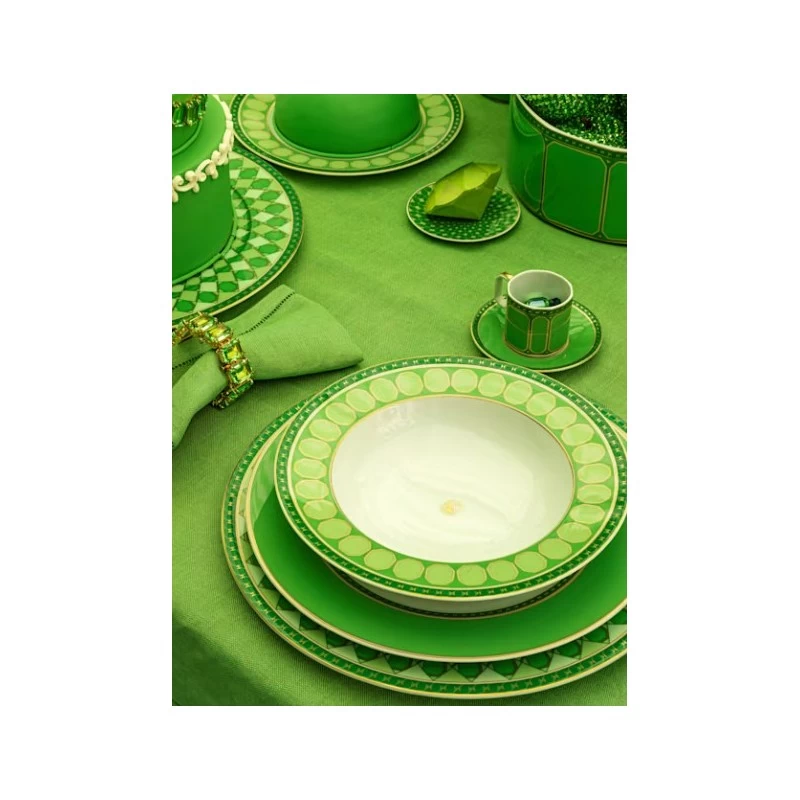 Questo piatto in porcellana riporta al centro il logo ad ottagono del brand e dettagli in oro dipinti a mano: un tocco glam chic per un modello classico.