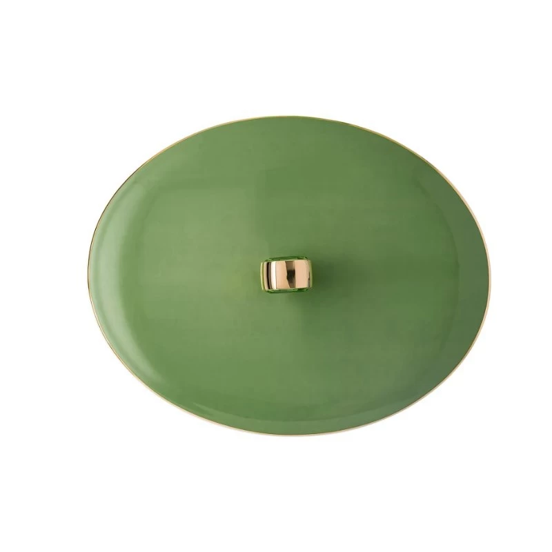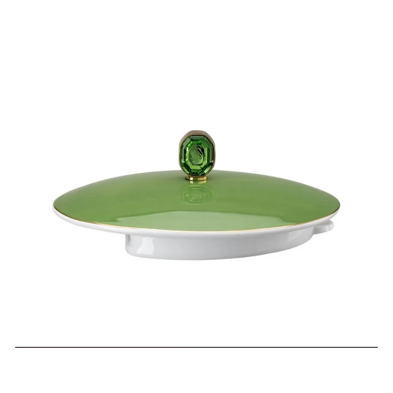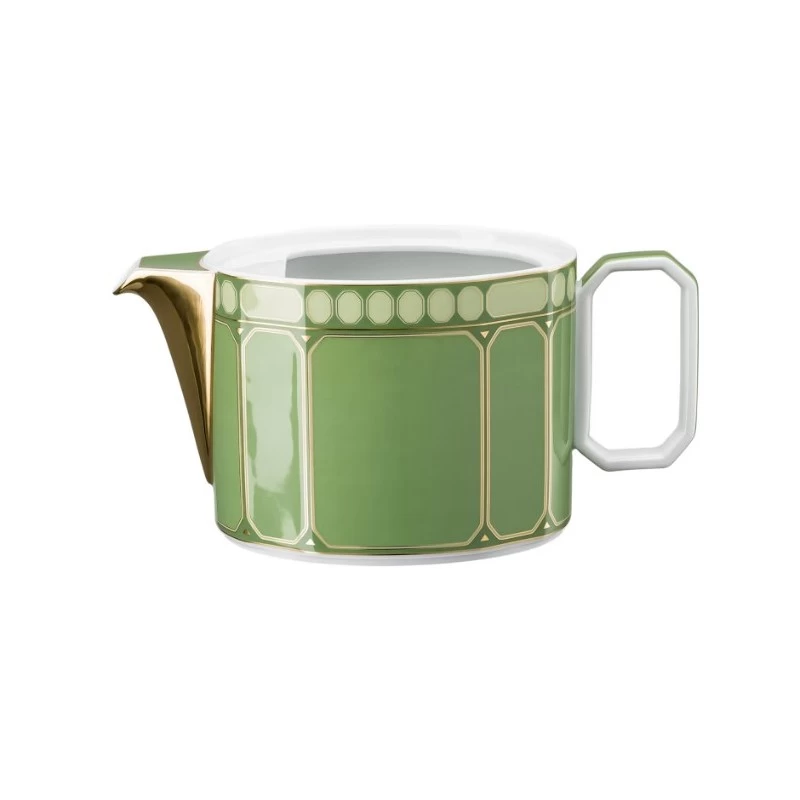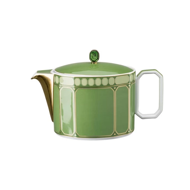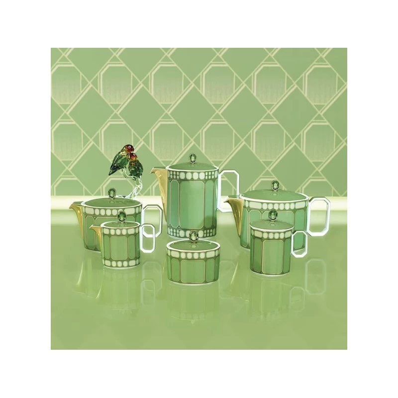 Queste teiera verde riporta preziosi fili in oro dipinti a mano, mentre sul coperchio fa bella scena di sé un raffinato cristallo Swarovski: l’ottagono del brand.