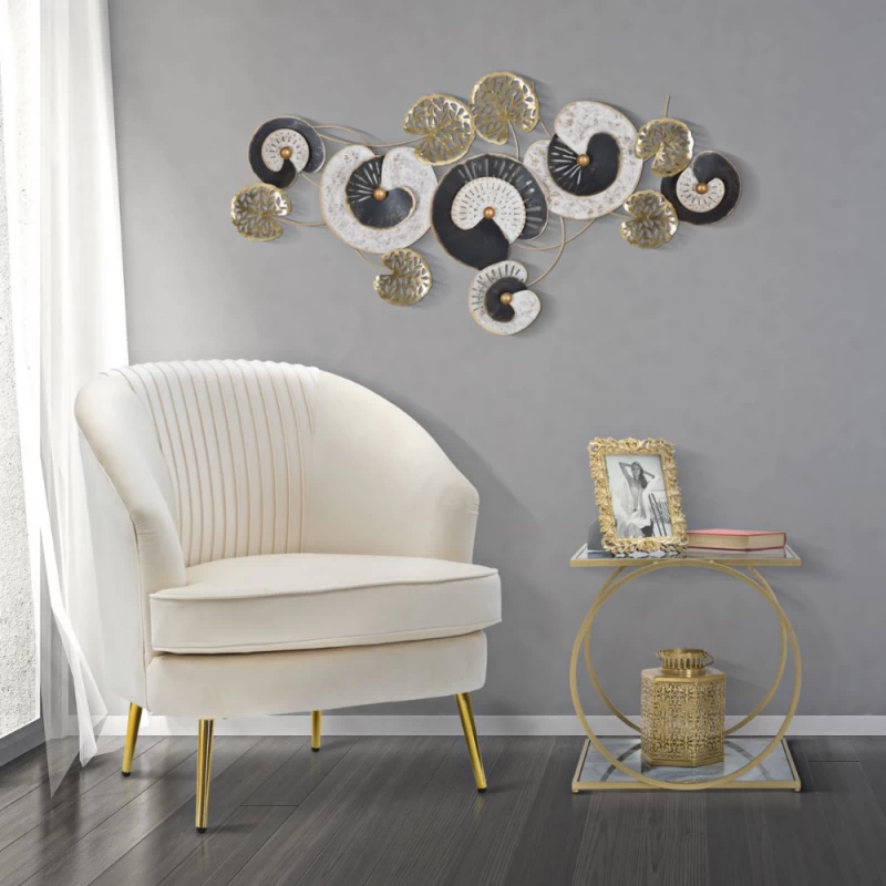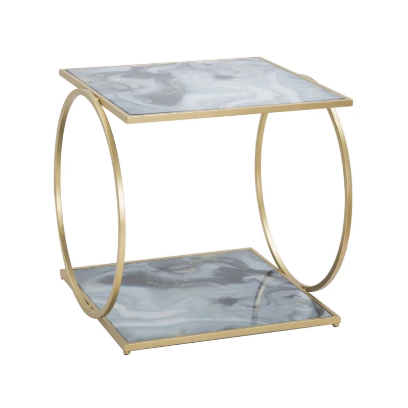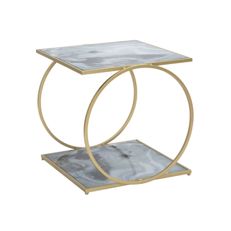 Ci compone di due livelli quadrati, realizzati in mdf con lastra decorativa in vetro effetto marmo, dalle sfumature raffinate. A sorreggerli, due cerchi dorati, che circondano l’intero perimetro dei piani.