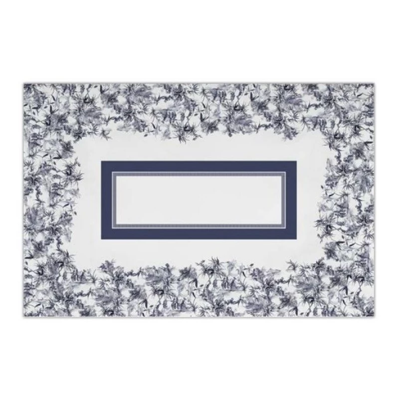 La tovaglia rettangolare è da 12 posti ed ha uno stile elegante ed impeccabile, caratterizzato da un decoro Toile de Jouy blu su fondo bianco.