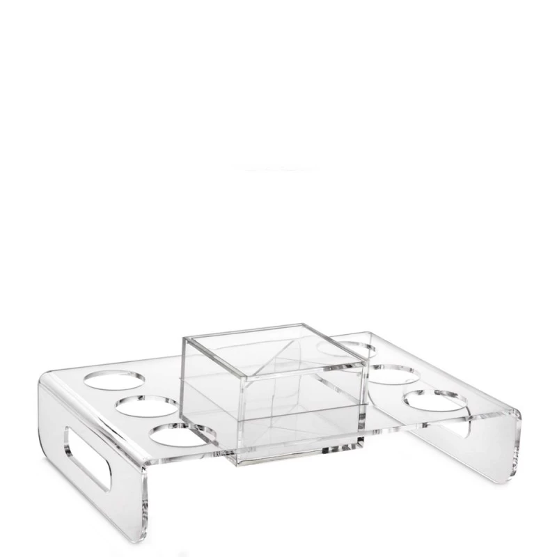 Il vassoio da caffè in plexiglass Vesta, Coffee Box, può ospitare fino a 6 bicchierini, anche monouso. Il box centrale può contenere palettine e zucchero.