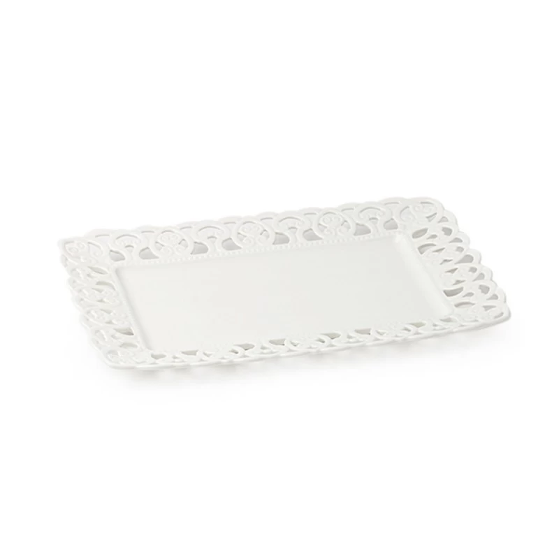 Il vassoio rettangolare in porcellana traforata di Hervit Creations è un oggetto di pregio assoluto, perfetto per chi desidera una bomboniera per matrimonio utile e che sappia stupire, per classe ed eleganza, i propri invitati. Ottimo anche come idea regalo home decor.